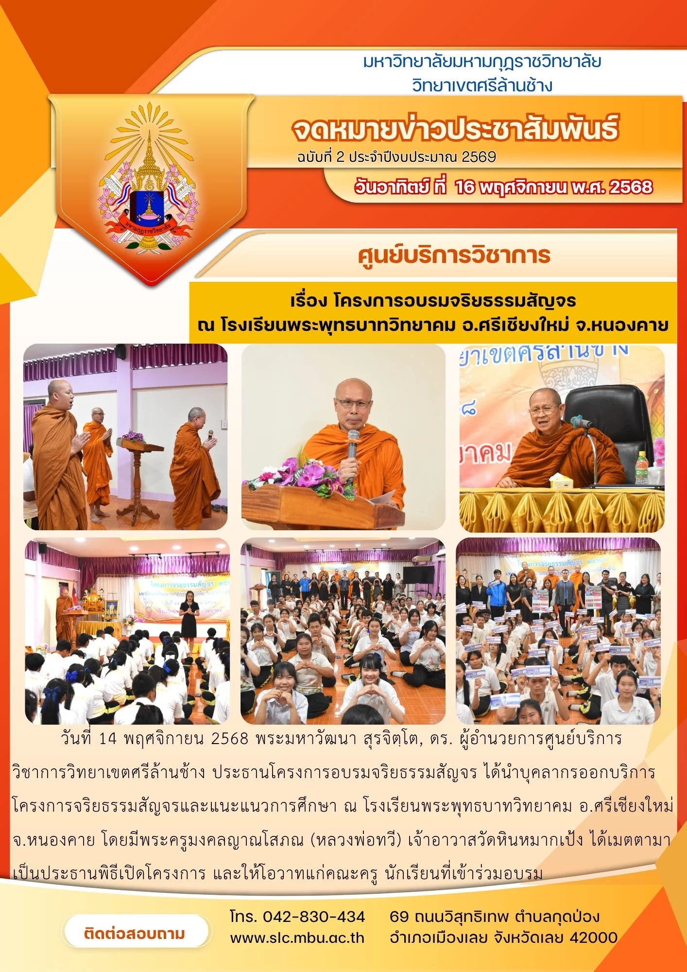 วันที่ 14 พฤศจิกายน 2568 พระมหาวัฒนา สุรจิตฺโต, ดร. ผู้อำนวยการศูนย์บริการวิชาการวิทยาเขตศรีล้านช้าง ประธานโครงการอบรมจริยธรรมสัญจร ได้นำบุคลากรออกบริการโครงการจริยธรรมสัญจรและแนะแนวการศึกษา ณ โรงเรียนพระพุทธบาทวิทยาคม อ.ศรีเชียงใหม่ จ.หนองคาย โดยมีพระครูมงคลญาณโสภณ (หลวงพ่อทวี) เจ้าอาวาสวัดหินหมากเป้ง ได้เมตตามาเป็นประธานพิธีเปิดโครงการ และให้โอวาทแก่คณะครู นักเรียนที่เข้าร่วมอบรม