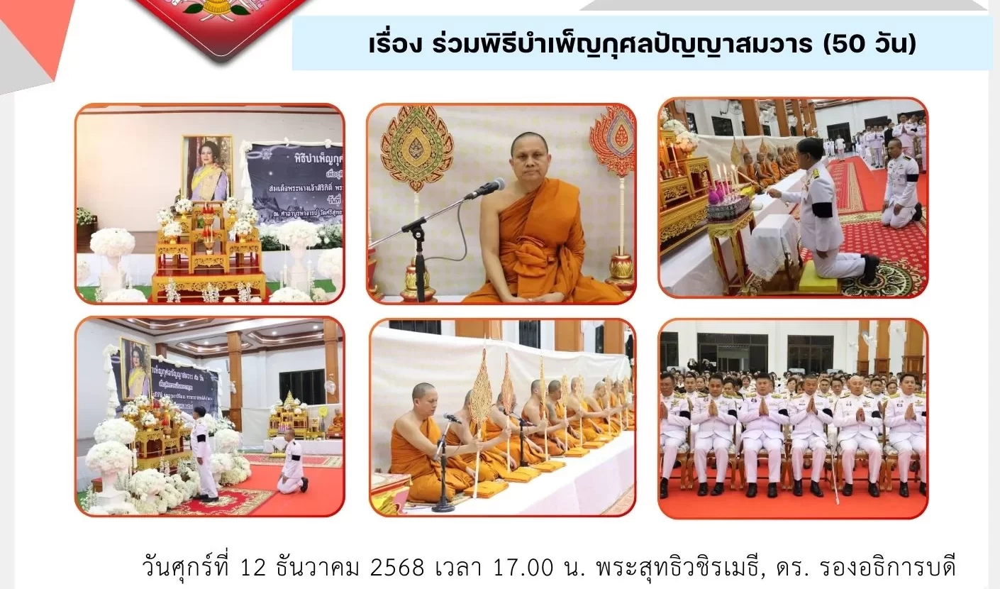 วันศุกร์ที่ 12 ธันวาคม 2568 เวลา 17.00 น. พระสุทธิวชิรเมธี, ดร. รองอธิการบดี และบุคลากร มหาวิทยาลัยมหามกุฏราชชวิทยาลัย ร่วมพิธีบำเพ็ญกุศลปัญญาสมวาร (50 วัน) เพื่ออุทิศถวายเป็นพระราชกุศล สมเด็จพระนางเจ้าสิริกิติ์ พระบรมราชินีนาถ พระบรมราชชนนีพันปีหลวง โดยมี พระสุทธิวชิรเมธี, ดร. เป็นประธานฝ่ายสงฆ์ นายชัยพจน์ จรูญพงศ์ ผู้ว่าราชการจังหวัดเลย เป็นประธานฝ่ายฆราวาส โดยมี หัวหน้าส่วนราชการ ข้าราชตุลาการ พลเรือน ทหาร ตำรวจ เจ้าหน้าที่จากทุกสังกัดในจังหวัดเลย ผู้บริหารองค์กรภาคเอกชน ผู้แทนองค์กรภาคเอกชน กลุ่มพลังมวลชน นักเรียน นักศึกษา และประชาชนชาวจังหวัดเลย เข้าร่วมพิธีฯ โดยพร้อมเพรียง