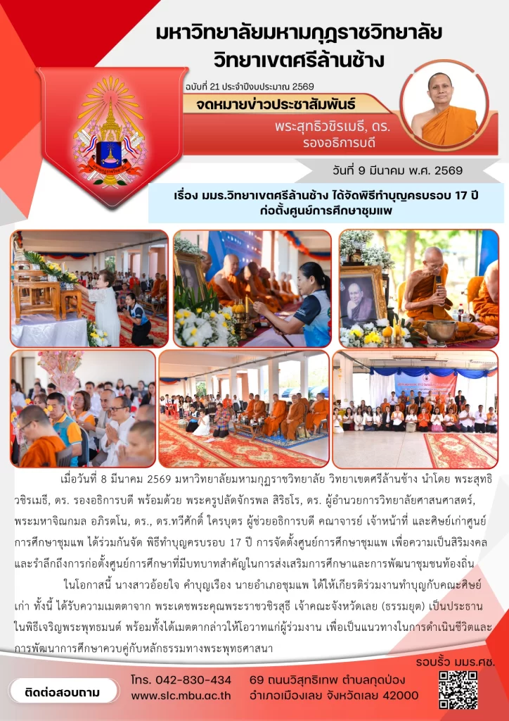 เมื่อวันที่ 8 มีนาคม 2569 มหาวิทยาลัยมหามกุฏราชวิทยาลัย วิทยาเขตศรีล้านช้าง นำโดย พระสุทธิวชิรเมธี, ดร. รองอธิการบดี พร้อมด้วย พระครูปลัดจักรพล สิริธโร, ดร. ผู้อำนวยการวิทยาลัยศาสนศาสตร์, พระมหาจิณกมล อภิรตโน, ดร., ดร.ทวีศักดิ์ ใครบุตร ผู้ช่วยอธิการบดี คณาจารย์ เจ้าหน้าที่ และศิษย์เก่าศูนย์การศึกษาชุมแพ ได้ร่วมกันจัด พิธีทำบุญครบรอบ 17 ปี การจัดตั้งศูนย์การศึกษาชุมแพ เพื่อความเป็นสิริมงคลและรำลึกถึงการก่อตั้งศูนย์การศึกษาที่มีบทบาทสำคัญในการส่งเสริมการศึกษาและการพัฒนาชุมชนท้องถิ่น