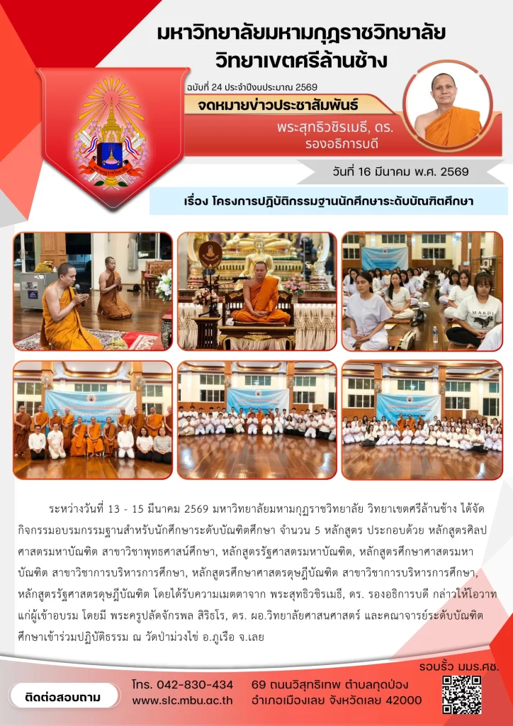 ระหว่างวันที่ 13 – 15 มีนาคม 2569 มหาวิทยาลัยมหามกุฏราชวิทยาลัย วิทยาเขตศรีล้านช้าง ได้จัดกิจกรรมอบรมกรรมฐานสำหรับนักศึกษาระดับบัณฑิตศึกษา จำนวน 5 หลักสูตร ประกอบด้วย หลักสูตรศิลปศาสตรมหาบัณฑิต สาขาวิชาพุทธศาสน์ศึกษา, หลักสูตรรัฐศาสตรมหาบัณฑิต, หลักสูตรศึกษาศาสตรมหาบัณฑิต สาขาวิชาการบริหารการศึกษา, หลักสูตรศึกษาศาสตรดุษฎีบัณฑิต สาขาวิชาการบริหารการศึกษา, หลักสูตรรัฐศาสตรดุษฎีบัณฑิต โดยได้รับความเมตตาจาก พระสุทธิวชิรเมธี, ดร. รองอธิการบดี กล่าวให้โอวาทแก่ผู้เข้าอบรม โดยมี พระครูปลัดจักรพล สิริธโร, ดร. ผอ.วิทยาลัยศาสนศาสตร์ และคณาจารย์ระดับบัณฑิตศึกษาเข้าร่วมปฏิบัติธรรม ณ วัดป่าม่วงไข่ อ.ภูเรือ จ.เลย