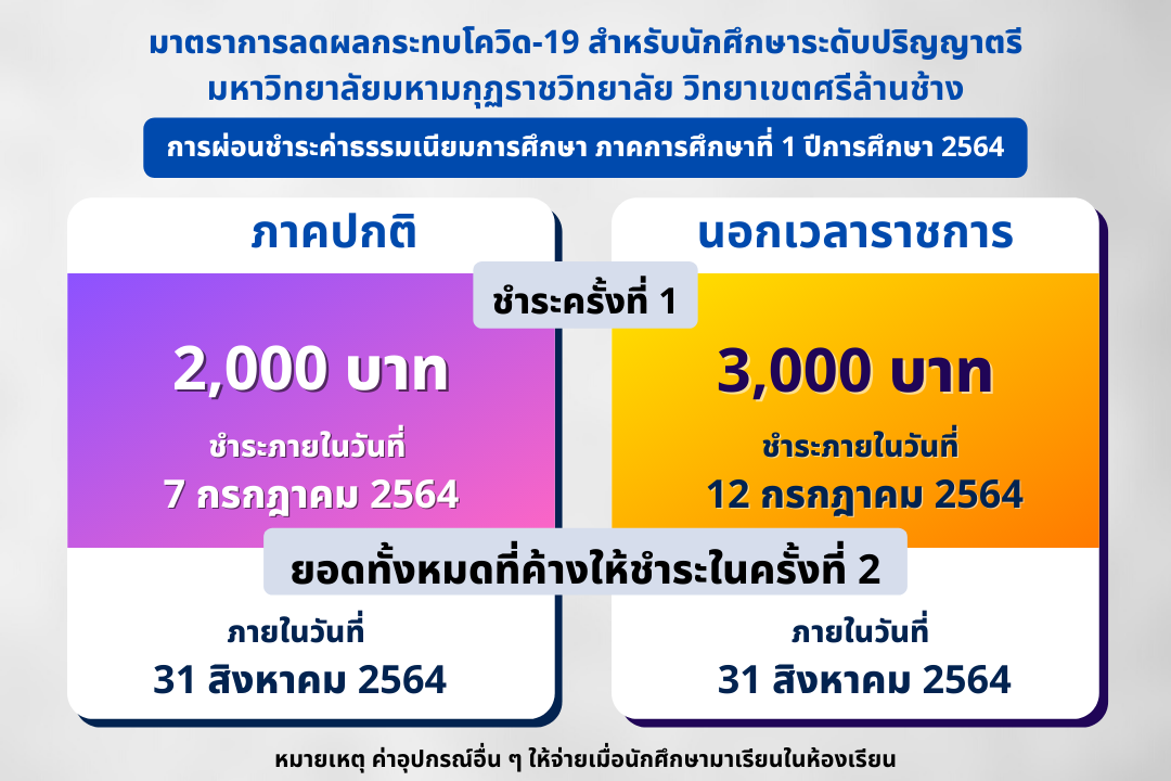 มาตรการลดผลกระทบโควิด-19 สำหรับนักศึกษาระดับปริญญาตรี การผ่อนชำระค่าธรรมเนียมการศึกษา ภาคการศึกษาที่ 1 ปีการศึกษา 2564