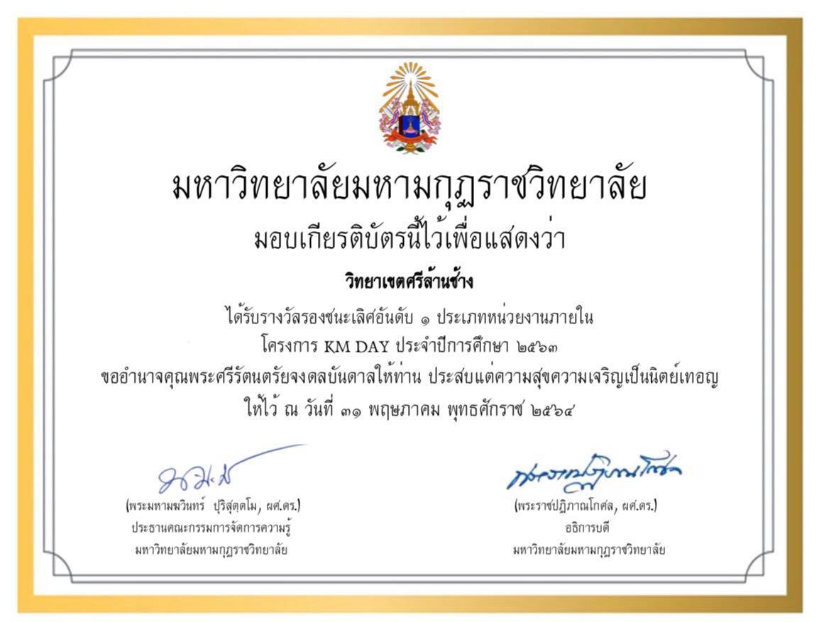 มหาวิทยาลัยมหามกุฏราชวิทยาลัย วิทยาเขตศรีล้านช้าง ได้รับรางวัลรองชนะเลิศ อันดับ ๑ ประเภทหน่วยงานภายในโครงการ KM DAY ประจำปีการศึกษา ๒๕๖๓ ณ วันที่ ๑๑ พฤษภาคม ๒๕๖๔