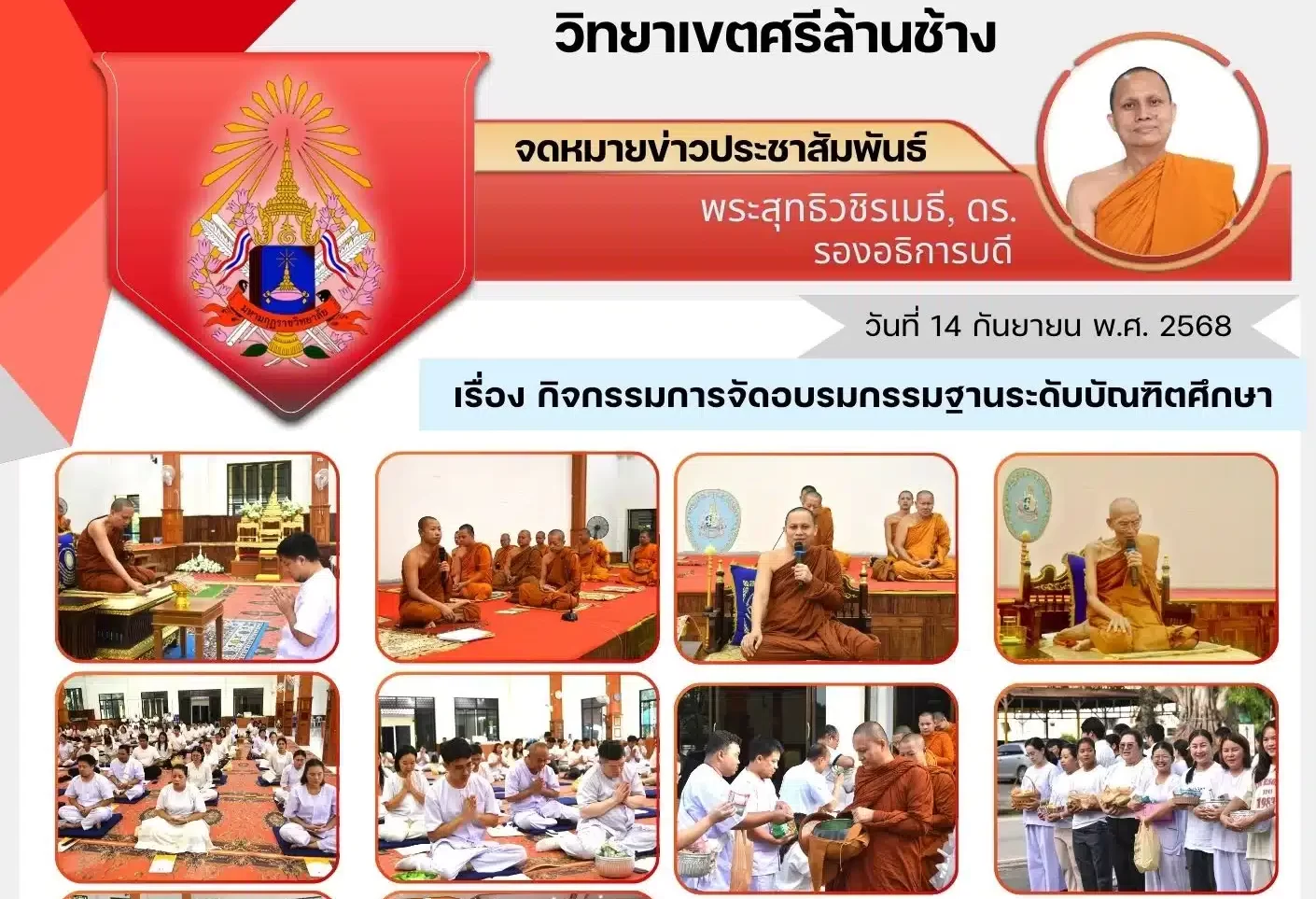 ระหว่างวันที่ 12-14 กันยายน 2568 มหาวิทยาลัยมหามกุฏราชวิทยาลัย วิทยาเขตศรีล้านช้าง ได้จัดกิจกรรมอบรมกรรมฐานสำหรับนักศึกษาระดับบัณฑิตศึกษา จำนวน 5 หลักสูตร ประกอบด้วย หลักสูตรศิลปศาสตรมหาบัณฑิต สาขาวิชาพุทธศาสน์ศึกษา, หลักสูตรรัฐศาสตรมหาบัณฑิต, หลักสูตรศึกษาศาสตรมหาบัณฑิต สาขาวิชาการบริหารการศึกษา, หลักสูตรศึกษาศาสตรดุษฎีบัณฑิต สาขาวิชาการบริหารการศึกษา, หลักสูตรรัฐศาสตรดุษฎีบัณฑิต โดยได้รับความเมตตาจาก พระราชวชิรสุธี เจ้าคณะจังหวัดเลย (ธ) เป็นประธานกล่าวเปิดโครงการและให้โอวาทแก่ผู้เข้าอบรม โดยมีผู้บริหาร พระสุทธิวชิรเมธี, ดร. รองอธิการบดี พระครูปลัดจักรพล สิริธโร, ดร. ผอ.วิทยาลัยศาสนศาสตร์ และคณาจารย์ระดับบัณฑิตศึกษาเข้าร่วมปฏิบัติธรรม
