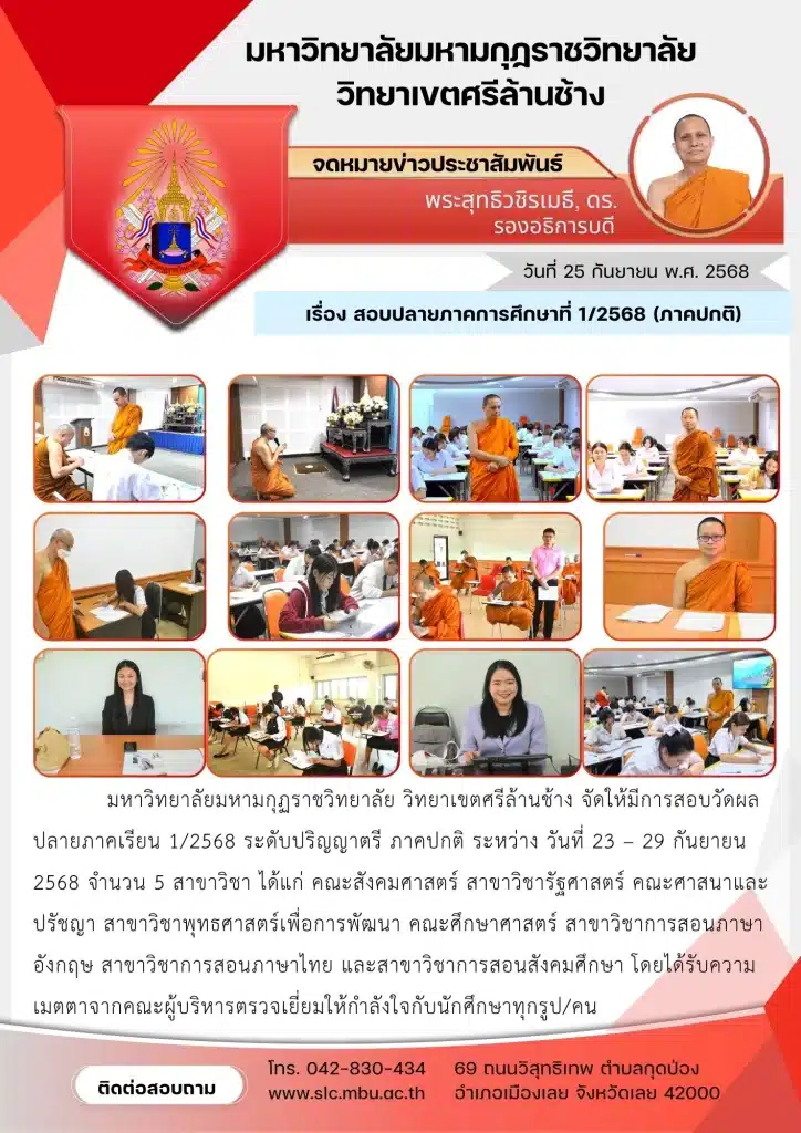 มหาวิทยาลัยมหามกุฏราชวิทยาลัย วิทยาเขตศรีล้านช้าง จัดให้มีการสอบวัดผลปลายภาคเรียน 1/2568 ระดับปริญญาตรี ภาคปกติ ระหว่าง วันที่ 23 – 29 กันยายน 2568 จำนวน 5 สาขาวิชา ได้แก่ คณะสังคมศาสตร์ สาขาวิชารัฐศาสตร์ คณะศาสนาและปรัชญา สาขาวิชาพุทธศาสตร์เพื่อการพัฒนา คณะศึกษาศาสตร์ สาขาวิชาการสอนภาษาอังกฤษ สาขาวิชาการสอนภาษาไทย และสาขาวิชาการสอนสังคมศึกษา โดยได้รับความเมตตาจากคณะผู้บริหารตรวจเยี่ยมให้กำลังใจกับนักศึกษาทุกรูป/คน