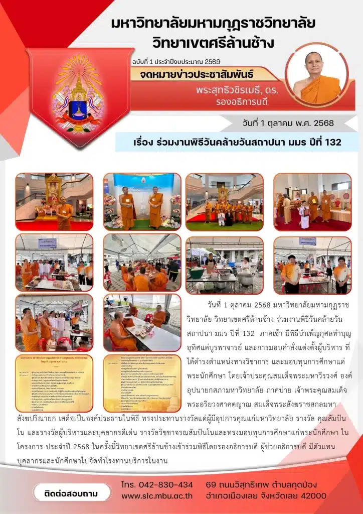 วันที่ 1 ตุลาคม 2568 มหาวิทยาลัยมหามกุฏราชวิทยาลัย วิทยาเขตศรีล้านช้าง ร่วมงานพิธีวันคล้ายวันสถาปนา มมร ปีที่ 132 ภาคเช้า มีพิธีบำเพ็ญกุศลทำบุญอุทิศแด่บูรพาจารย์ และการมอบคำสั่งแต่งตั้งผู้บริหาร ที่ได้ดำรงตำแหน่งทางวิชาการ และมอบทุนการศึกษาแด่พระนักศึกษา โดยเจ้าประคุณสมเด็จพระมหาวีรวงศ์ องค์อุปนายกสภามหาวิทยาลัย ภาคบ่าย เจ้าพระคุณสมเด็จพระอริยวงศาคตญาณ สมเด็จพระสังฆราชสกลมหาสังฆปริณายก เสด็จเป็นองค์ประธานในพิธี ทรงประทานรางวัลแด่ผู้มีอุปการคุณแก่มหาวิทยาลัย รางวัล คุณสัมปันโน และรางวัลผู้บริหารและบุคลากรดีเด่น รางวัลวิชฺชาจรณสัมปันโนและทรงมอบทุนการศึกษาแก่พระนักศึกษา ในโครงการ ประจำปี 2568 ในครั้งนี้วิทยาเขตศรีล้านช้างเข้าร่วมพิธีโดยรองอธิการบดี ผู้ช่วยอธิการบดี มีตัวแทนบุคลากรและนักศึกษาไปจัดทำโรงทานบริการในงาน
