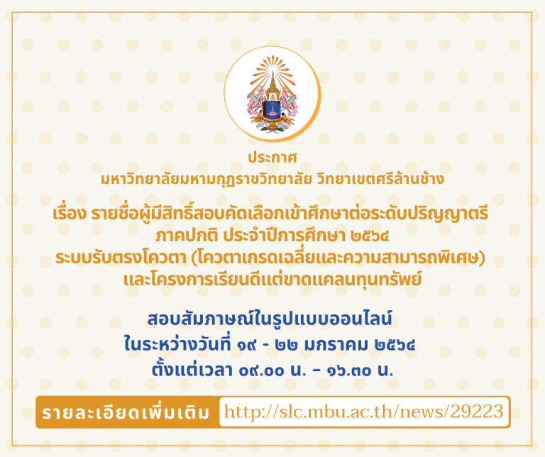 ข่าวประชาสัมพันธ์ ประกาศ รายชื่อผู้มีสิทธิ์สอบคัดเลือกเพื่อเข้าศึกษาต่อระดับปริญญาตรี ภาคปกติ การรับตรง (รอบสอง) ประจำปีการศึกษา 256312 พฤษภาคม 202012 พฤษภาคม 2020