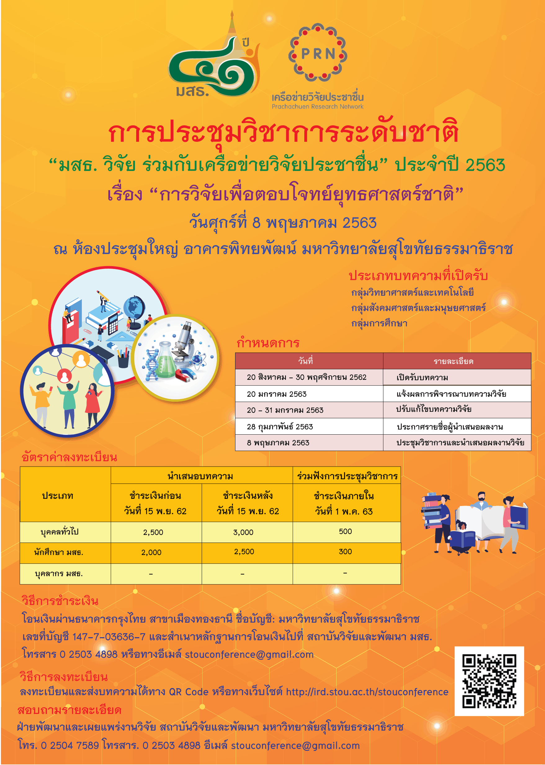 ขอเชิญบุคลากรเข้าร่วมการประชุมวิชาการและการนำเสนอผลงานวิจัยระดับชาติ “มสธ. วิจัย ร่วมกับเครือข่ายวิจัยประชาชื่น” ประจำปี ๒๕๖๓ วันศุกร์ที่ ๘ พฤษภาคม ๒๕๖๓ ณ ห้องประชุมใหญ่ อาคารพิทยพัฒน์ มหาวิทยาลัยสุโขทัยธรรมาธิราช รายละเอียดเพิ่มเติม http://ird.stou.ac.th/stouconference/