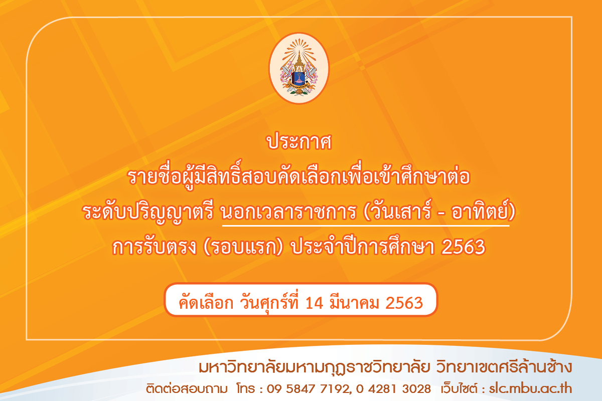 ประกาศ รายชื่อผู้มีสิทธิ์สอบคัดเลือกเพื่อเข้าศึกษาต่อระดับปริญญาตรี นอกเวลาราชการ (วันเสาร์-อาทิตย์) การรับตรง ประจำปีการศึกษา 2563