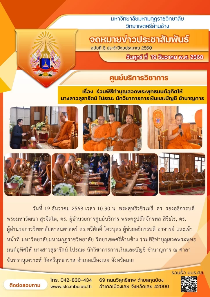 วันที่ 19 ธันวาคม 2568 เวลา 10.30 น. พระสุทธิวชิรเมธี, ดร. รองอธิการบดีพระมหาวัฒนา สุรจิตฺโต, ดร. ผู้อำนวยการศูนย์บริการ พระครูปลัดจักรพล สิริธโร, ดร. ผู้อำนวยการวิทยาลัยศาสนศาสตร์ ดร.ทวีศักดิ์ ใครบุตร ผู้ช่วยอธิการบดี อาจารย์ และเจ้าหน้าที่ มหาวิทยาลัยมหามกุฏราชวิทยาลัย วิทยาเขตศรีล้านช้าง ร่วมพิธีทำบุญสวดพระพุทธมนต์อุทิศให้ นางสาวสุธารัตน์ โปรณะ นักวิชาการการเงินและบัญชี ชำนาญการ ณ ศาลาจันทรานุเคราะห์ วัดศรีสุทธาวาส อำเภอเมืองเลย จังหวัดเลย