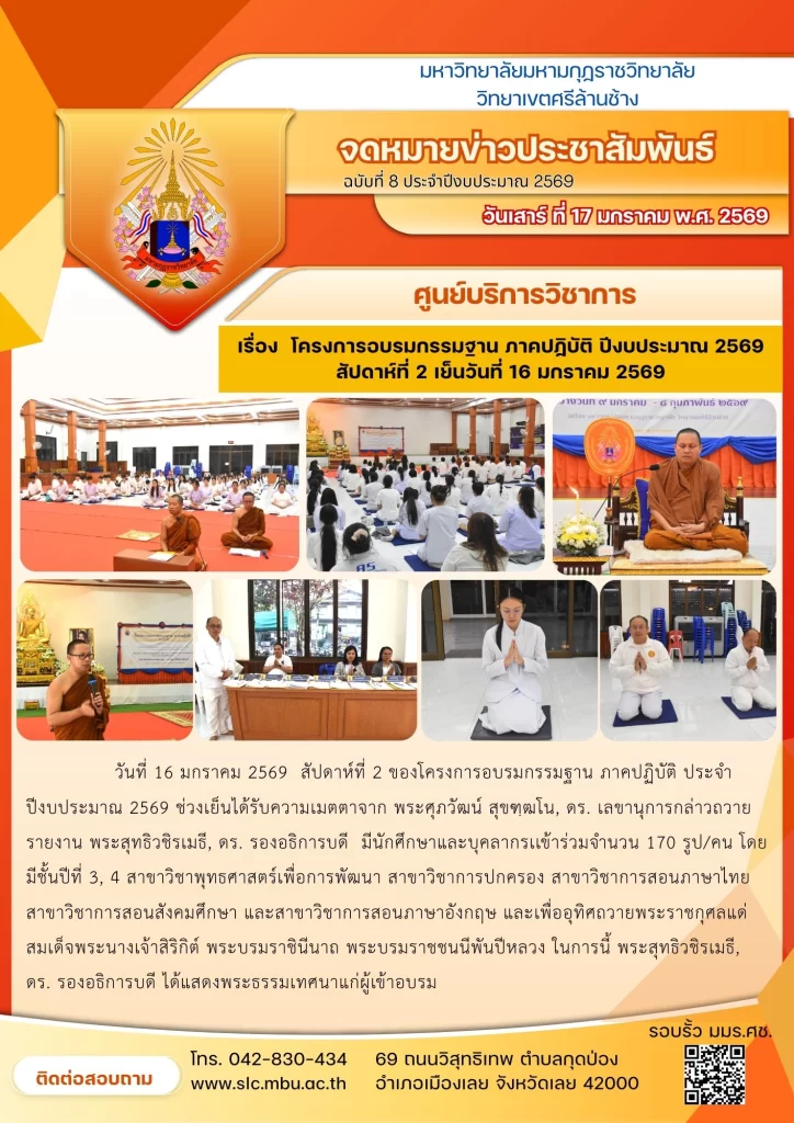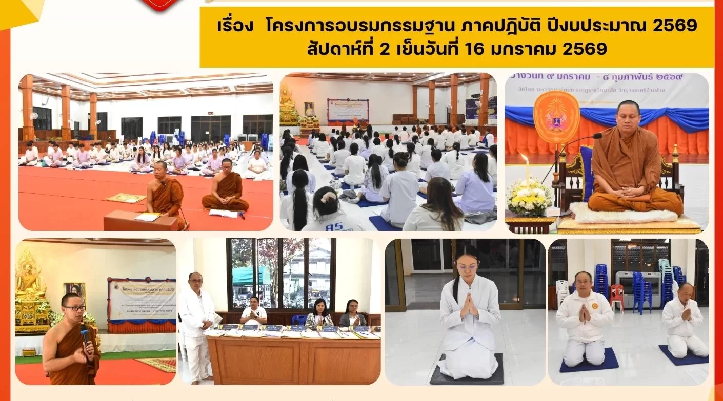 วันที่ 16 มกราคม 2569 สัปดาห์ที่ 2 ของโครงการอบรมกรรมฐาน ภาคปฏิบัติ ประจำปีงบประมาณ 2569 ช่วงเย็นได้รับความเมตตาจาก พระศุภวัฒน์ สุขฑฺฒโน, ดร. เลขานุการกล่าวถวายรายงาน พระสุทธิวชิรเมธี, ดร. รองอธิการบดี มีนักศึกษาและบุคลากรเเข้าร่วมจำนวน 170 รูป/คน โดยมีชั้นปีที่ 3, 4 สาขาวิชาพุทธศาสตร์เพื่อการพัฒนา สาขาวิชาการปกครอง สาขาวิชาการสอนภาษาไทย สาขาวิชาการสอนสังคมศึกษา และสาขาวิชาการสอนภาษาอังกฤษ และเพื่ออุทิศถวายพระราชกุศลแด่สมเด็จพระนางเจ้าสิริกิต์ พระบรมราชินีนาถ พระบรมราชชนนีพันปีหลวง ในการนี้ พระสุทธิวชิรเมธี, ดร. รองอธิการบดี ได้แสดงพระธรรมเทศนาแก่ผู้เข้าอบรม