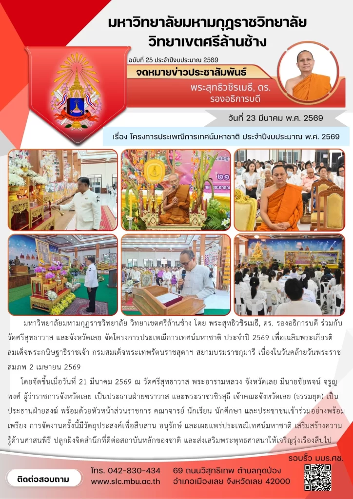 มหาวิทยาลัยมหามกุฏราชวิทยาลัย วิทยาเขตศรีล้านช้าง โดย พระสุทธิวชิรเมธี, ดร. รองอธิการบดี ร่วมกับวัดศรีสุทธาวาส และจังหวัดเลย จัดโครงการประเพณีการเทศน์มหาชาติ ประจำปี 2569 เพื่อเฉลิมพระเกียรติ สมเด็จพระกนิษฐาธิราชเจ้า กรมสมเด็จพระเทพรัตนราชสุดาฯ สยามบรมราชกุมารี เนื่องในวันคล้ายวันพระราชสมภพ 2 เมษายน 2569