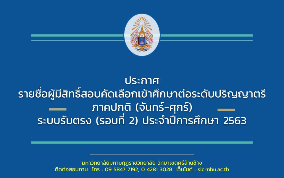 ประกาศ รายชื่อผู้มีสิทธิ์สอบคัดเลือกเพื่อเข้าศึกษาต่อระดับปริญญาตรี ภาคปกติ การรับตรง (รอบสอง) ประจำปีการศึกษา 2563