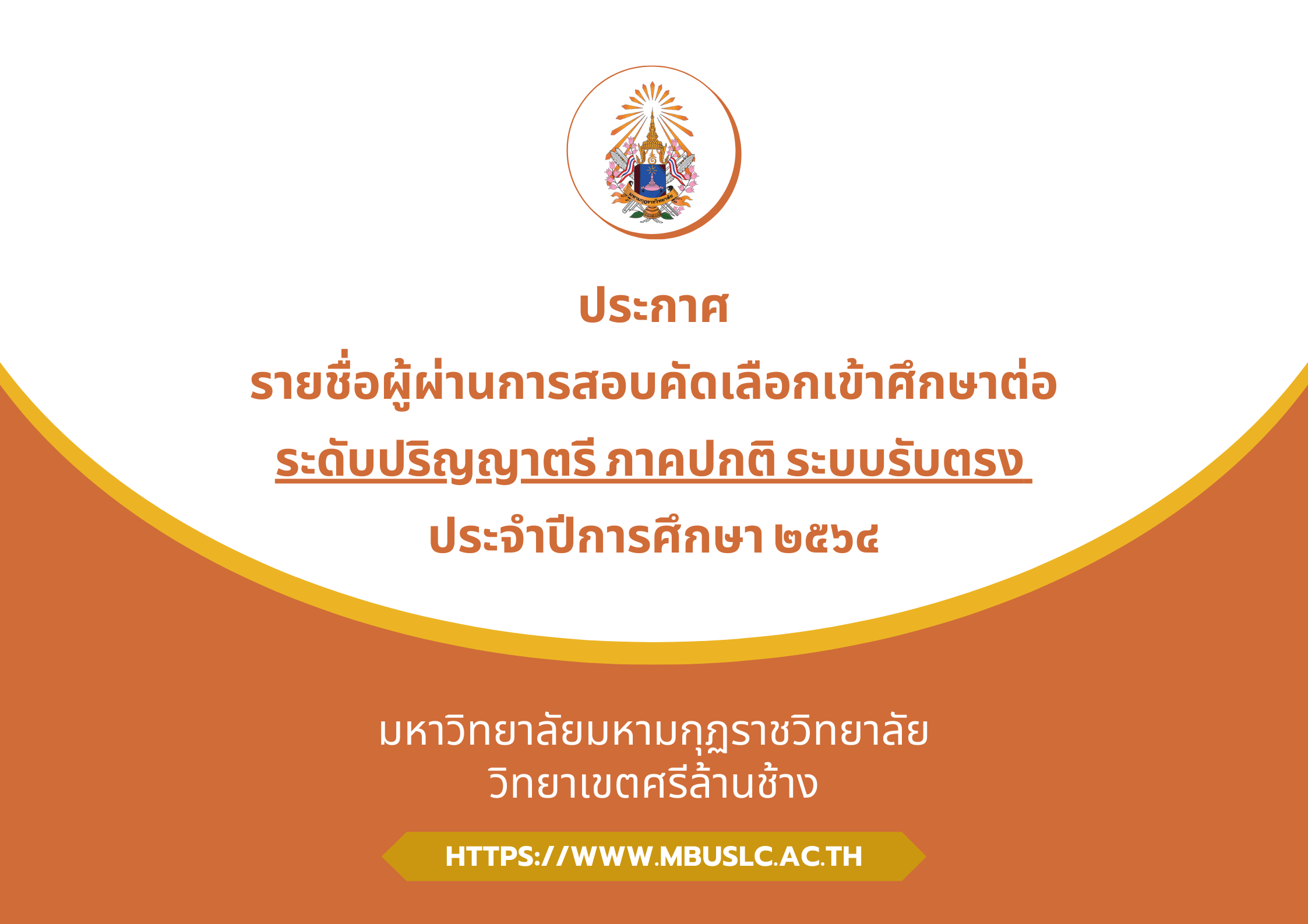 - ยืนยันสิทธิ์การเข้าศึกษาต่อผ่านทางเว็บไซต์ http://admissions.mbuslc.ac.th หลังยืนยันสิทธิ์เข้าศึกษาต่อรอการตรวจสอบ 1-2 วันทำการ และสามารถกลับมาตรวจสอบสถานะและนำเลขประจำตัวนักศึกษา ไปดำเนินการรายงานตัว ตามขั้นที่ 2
