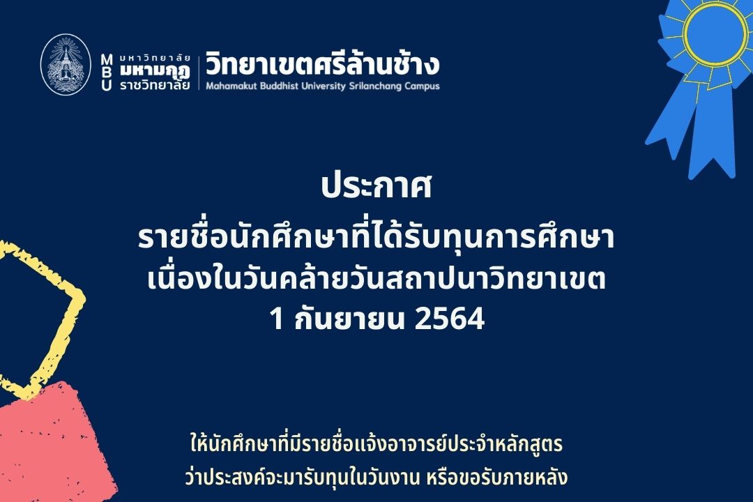 ประกาศ รายชื่อนักศึกษาที่ได้รับทุนการศึกษา เนื่องในวันคล้ายวันสถาปนาวิทยาเขต 1 กันยายน 2564