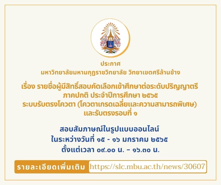 ประกาศรายชื่อผู้ผ่านการคัดเลือก วันที่ ๒๐ มกราคม ๒๕๖๕ โดยสามารถตรวจสอบรายชื่อ ได้ที่เว็บไซต์ http://www.admissions.mbuslc.ac.th หรือที่ป้ายประกาศหน้าห้องทะเบียนและวัดผล