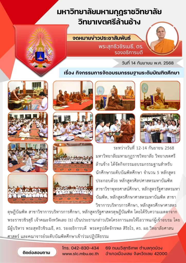 ระหว่างวันที่ 12-14 กันยายน 2568 มหาวิทยาลัยมหามกุฏราชวิทยาลัย วิทยาเขตศรีล้านช้าง ได้จัดกิจกรรมอบรมกรรมฐานสำหรับนักศึกษาระดับบัณฑิตศึกษา จำนวน 5 หลักสูตร ประกอบด้วย หลักสูตรศิลปศาสตรมหาบัณฑิต สาขาวิชาพุทธศาสน์ศึกษา, หลักสูตรรัฐศาสตรมหาบัณฑิต, หลักสูตรศึกษาศาสตรมหาบัณฑิต สาขาวิชาการบริหารการศึกษา, หลักสูตรศึกษาศาสตรดุษฎีบัณฑิต สาขาวิชาการบริหารการศึกษา, หลักสูตรรัฐศาสตรดุษฎีบัณฑิต โดยได้รับความเมตตาจาก พระราชวชิรสุธี เจ้าคณะจังหวัดเลย (ธ) เป็นประธานกล่าวเปิดโครงการและให้โอวาทแก่ผู้เข้าอบรม โดยมีผู้บริหาร พระสุทธิวชิรเมธี, ดร. รองอธิการบดี พระครูปลัดจักรพล สิริธโร, ดร. ผอ.วิทยาลัยศาสนศาสตร์ และคณาจารย์ระดับบัณฑิตศึกษาเข้าร่วมปฏิบัติธรรม